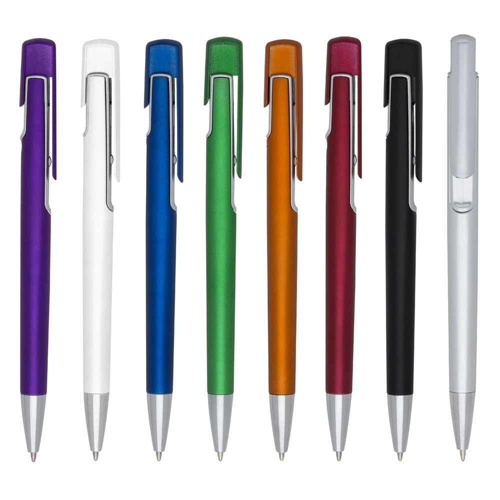 Descrição: Caneta plástica com carga esferográfica azul e acionamento por clique.